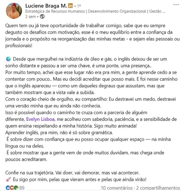 Com minha experiência em Recursos Humanos e recrutamento, passei a enxergar o inglês de outra forma: como uma ferramenta de comunicação real, especialmente no ambiente profissional.